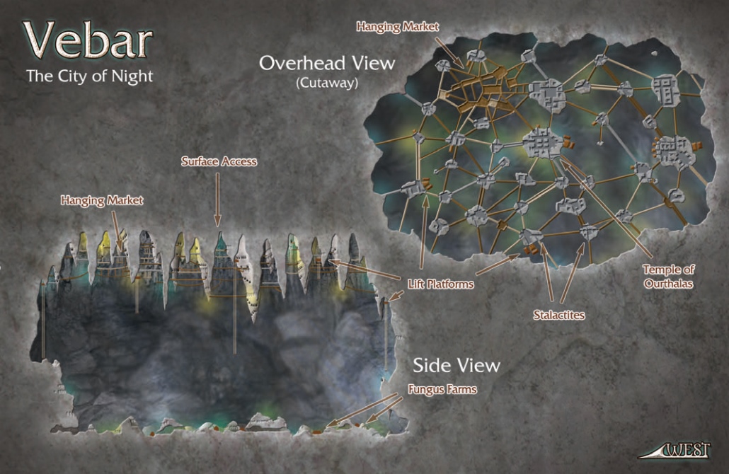 Уникальное поселение, которое располагается под землёй, если точнее - под Камненогой. Жители совершенно отвыкли от солнечного света, хотя с поверхностью их связывает пара лифтов. При помощи них так называемые "поверхностники" поднимаются наверх ночью для охоты и сбора ягод. Основным питанием поселения являются грибы и плесень, которые жители выращивают на дне пещеры. Весь город красиво подсвечен этими фермами. Политическим устройство города является поклонение Орталусу, машине, которая закреплена под потолком и периодически выделяет из своих труб жидкости с полезными свойствами.